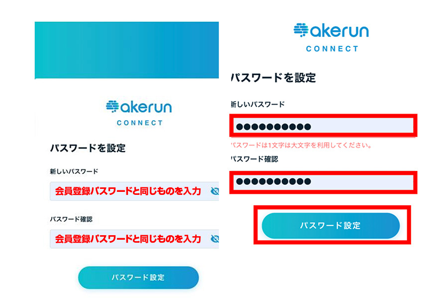 メールのリンクをクリックすると、Akerunのサイトに移動します。任意のパスワードを設定して、パスワード設定をクリックしてくだい。